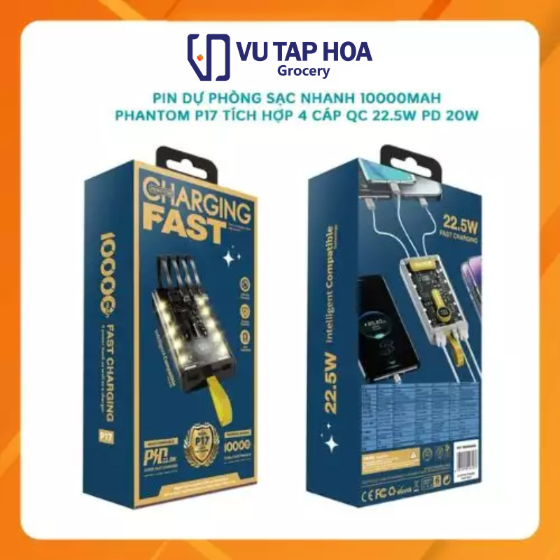 Pin Dự Phòng Sạc Nhanh Phantom P17 Dung Lượng 10000Mah Tích Hợp 4 Cáp Sạc – Hỗ Trợ Qc 22.5 Và Pd 20W