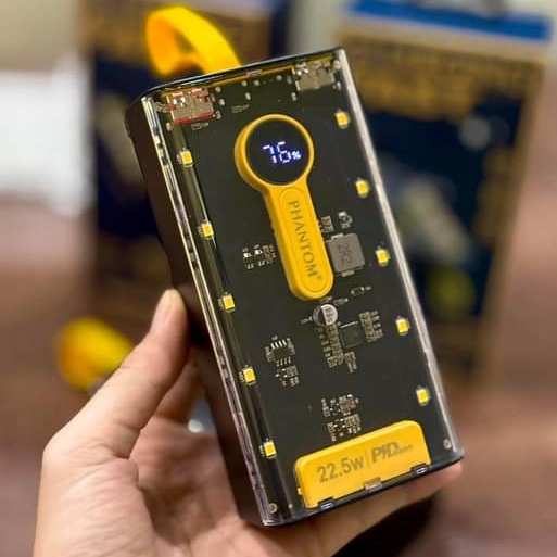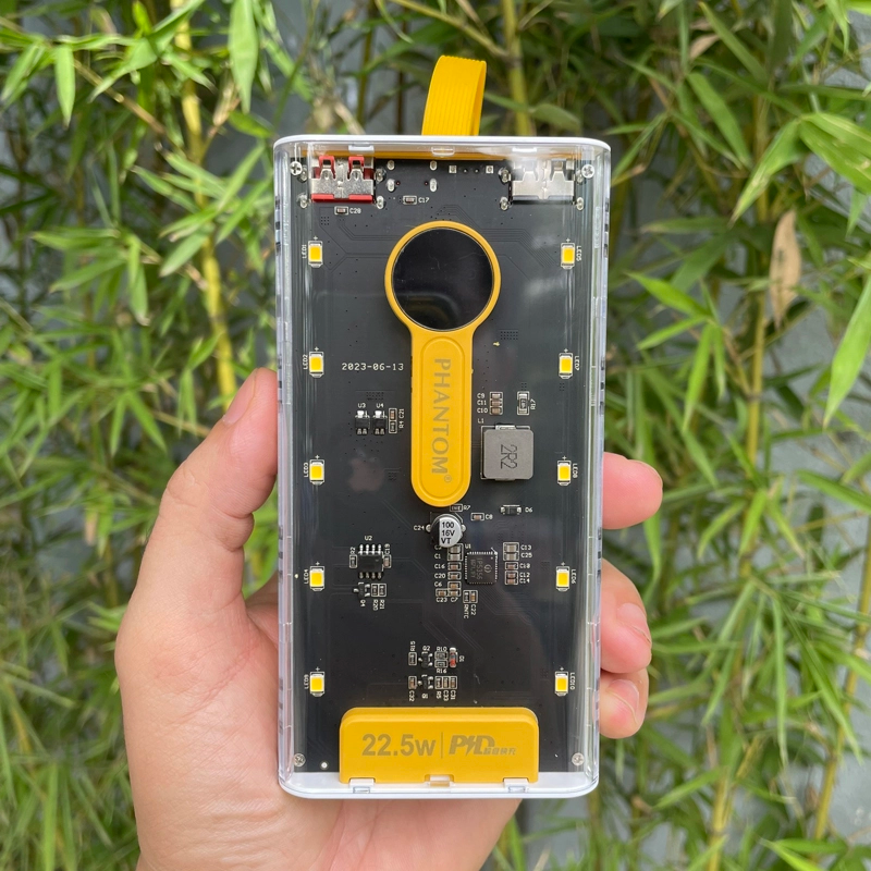 Pin sạc dự phòng 10000mAh PHANTOM P17 có vẻ ngoài trang suốt có thể nhìn rõ các linh kiện bên trong 135 x 68 *27mm cùng trọng lượng chỉ 330g.