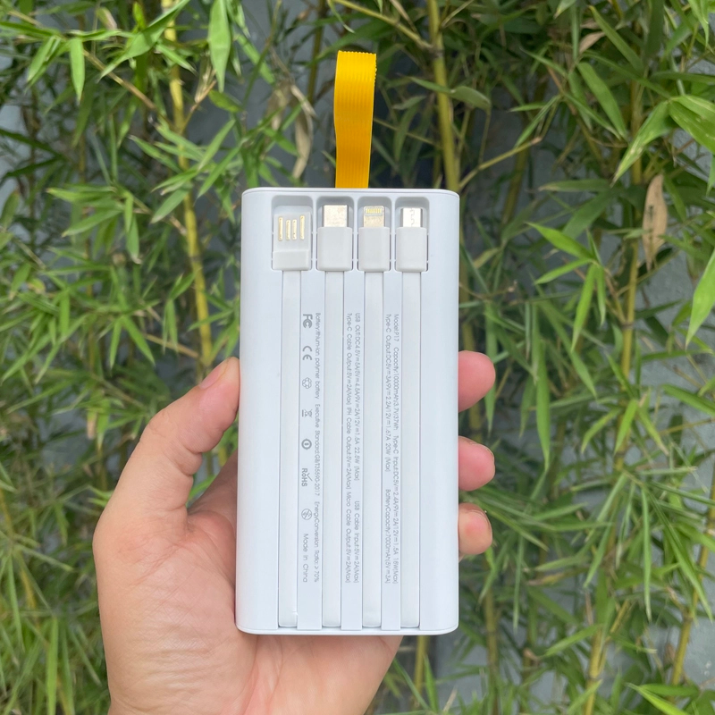 Trên pin dự phòng tích hợp 3 cổng sạc và 4 cáp sạc bao gồm: 2 cổng USB, 1 cổng, 1 cáp typeC, 1 cáp LN, 1 cáp microUSB, 1 cáp USB. Trong đó cổng typeC vừa có thể hỗ trợ sạc vào lẫn sạc ra lên đến 20W, 1 cổng USB 1 và 1 cáp typeC hỗ trợ sạc ra 22.5W rút ngắn thời gian sạc đầy giúp đảm bảo cung cấp năng lượng cho thiết bị của bạn một cách tiện lợi nhất.